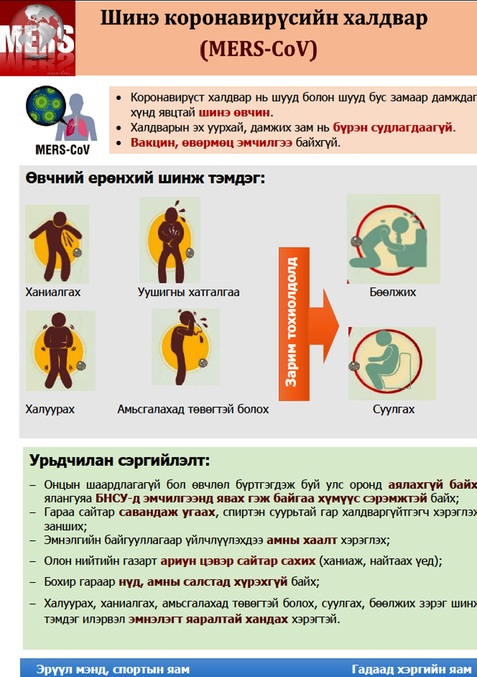 Нийслэлийн Эрүүл мэндийн газар Коронавируст халдвараас сэргийлэх, бэлэн байдлыг хангах төлөвлөгөө гаргаж харьяа байгууллагуудад хүргүүлэн мэргэжил, арга зүйгээр ханган ажиллаж байна. Энэ оны 06 сарын 11-ны байдлаар Коронавируст халдвар БНСУ-д нийт 108 лабораториор батлагдсан тохиолдол бүртгэгдэж, 9 хүн нас барсан байна. Харин Дэлхий дахинд уг вирусын нийт 1271 тохиолдол бүртгэгдэж, 453 хүн нас бараад байна. Иймд нийслэлийн иргэддээ дараахь зөвлөмжийг хүргэж байна. Үүнд: