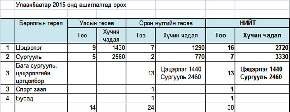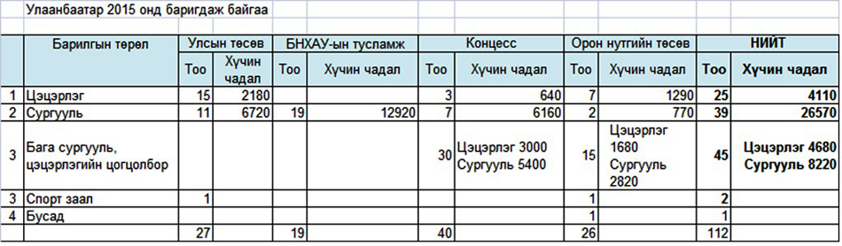 Нийслэлд 2012-2014 онд 29032 хүүхдийн хүчин чадалтай 61 сургуулийн, 9440 хүүхдийн хүчин чадалтай 94 цэцэрлэг, 2715 хүүхдийн хүчин чадалтай 26 дотуур байр, 28 спорт заал барьсан бол 2015 онд нийт 5690 суудал бүхий 14 сургууль, 5820 ор бүхий 47 цэцэрлэг, 2460 суудал, 1440 ор бүхий 13 бага сургууль, цэцэрлэгийн цогцолбор, 920 ор бүхий 9 дотуур байр, 7 спорт заалыг ашиглалтад оруулахаар ажиллаж байна. Улсын төсвийн хөрөнгөөр боловсролын салбарт 153, орон нутгийн хөрөнгөөр 26 барилгын ажил явагдаж байгаа бол концессын гэрээгээр 40 цэцэрлэг сургууль, БНХАУ-ын тусламжаар 1 цэцэрлэг 21 сургууль, Японы тусламжаар 10 цэцэрлэгийн барилга баригдана. 2012 оноос хойш барилга нь ашиглалтаас гарсан Сүхбаатар дүүргийн 3, 11 дүгээр сургуулийн барилгын ажил дуусч энэ онд ашиглалтад орох юм. Мөн 2012 оноос барилга нь ашиглалтаас гарсан Баянзүрх дүүргийн 10 дугаар тусгай цэцэрлэг, 146 дугаар цэцэрлэг, Баянгол дүүргийн 18 дугаар цэцэрлэг, Хан-Уул дүүргийн 32, Баянгол дүүргийн 73, 38, 2014 онд зогссон Баянзүрх дүүргийн 14 дүгээр сургуулийн барилгын ажлын төсөв нь шийдэгдэж, гүйцэтгэгч нь тодроод байна. Эдгээр сургууль, цэцэрлэгийн барилгыг буулгах ажил энэ онд эхэлнэ. Мөн нийслэлд БНХАУ-ын тусламжаар 19 сургууль шинээр барьж эхлэх юм. Улс, орон нутгийн хөрөнгөөр 2015 онд баригдаж байгаа 179 барилгын 91 нь энэ онд ашиглалтад орж сургуулийн хүчин чадал 8150 суудал, цэцэрлэгийн хүчин чадал 7260 ороор нэмэгдэх тооцоотой байна. Өнөөдрийн байдлаар улсын төсвийн хөрөнгөөр 4448 суудлын хүчин чадалтай 8 сургууль, 1000 хүүхдийн хүчин чадалтай 10 цэцэрлэгийн барилга ашиглалтад орсон байна. Мөн 350 хүүхэд хүлээн авах 2 дотуур байр, 4 спорт заалны барилга шинээр ашиглалтад орлоо. Харин 9 дүгээр сард 15 барилга (825 хүүхдийн 7 цэцэрлэг, 890 суудалтай 3 сургууль, 180 ортой 2 дотуур байр, 3 спорт заал) нэмж ашиглалтад орно гэж Нийслэлийн ЗДТГ-ын Хэвлэл мэдээлэл, олон нийттэй харилцах хэлтсээс мэдээллээ.