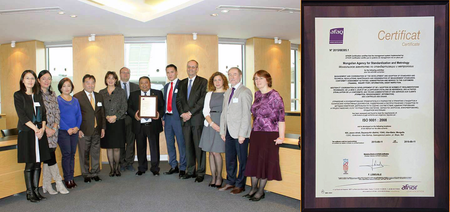 АФНОР Баталгаажуулалтын Ерөнхий захирал Франк Лөбөгл 2015 оны 10 дугаар сарын 26-нд Парис хотноо Монгол Улсын стандартчилал, хэмжил зүйн газрын дарга Г.Гантөмөрт AFAQ ISO 9001 гэрчилгээг албан ёсоор гардуулав. Ийнхүү Стандартчилал, хэмжил зүйн газар нь хэрэглэгчдийнхээ сэтгэл ханамжийг дээшлүүлэхэд чиглэсэн удирдлагыг хэрэгжүүлж чадсанаараа бүтэц, зохион байгуулалтад чанарын шилдэг хамтлагт нэгдэж буй томоохон үйл явдал юм.