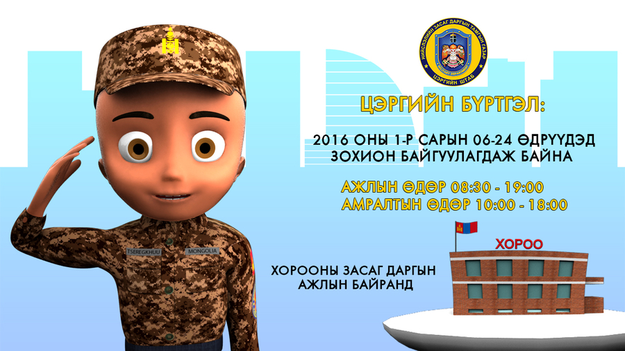 Нийслэлийн хэмжээнд Цэргийн үүрэгтэн, бэлтгэл офицеруудын бүртгэл 01 сарын 06-нд эхэлсэн бөгөөд 01 сарын 24-ний өдөр хүртэл үргэлжлэх юм. Цэргийн бүртгэлд 18-50 насны эрэгтэйчүүд, 55 хүртэл насны дунд офицер, ахлагч, 60 хүртэл насны дээд, ахлах офицерууд хамрагдана. Бүртгүүлэхдээ Иргэний үнэмлэх, Бэлтгэл офицерын үнэмлэх, Цэргийн үүрэгтний үнэмлэх /байхгүй бол 2 хувь цээж зураг /, ажлын газрын болон оюутны үнэмлэхтэйгээ харьяа хорооны Засаг даргын ажлын байранд ажлын өдрүүдэд 08:30-19:00 цаг хүртэл, амралтын өдрүүдэд 10:00-18:00 цагийн хооронд очиж бүртгүүлнэ. Тогтоосон хугацаанд цэргийн бүртгэлдээ хамрагдаж иргэний цэргийн үүргээ биелүүлнэ үү гэж Нийслэлийн ЗДТГ-ын Хэвлэл мэдээлэл, олон нийттэй харилцах хэлтсээс мэдээллээ.