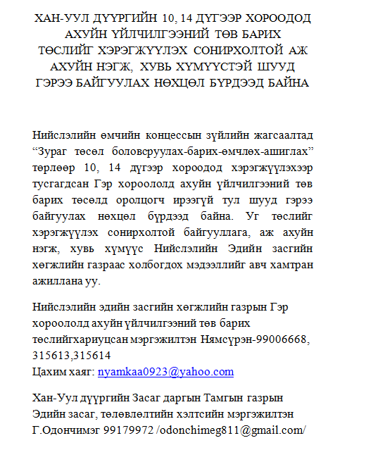 ХУД-ЫН НЭГДСЭН ЭМНЭЛЭГТ ГАРСАН УУРЫН ЗУУХНЫ ГЭМТЭЛТЭЙ ДҮҮРГИЙН ЗАСАГ ДАРГА ТАНИЛЦАЖ, ХЭВИЙН ҮЙЛ АЖИЛЛАГААНД ОРУУЛАХААР АЖИЛЛАЖ БАЙНА 2016-11-24 09:37:50