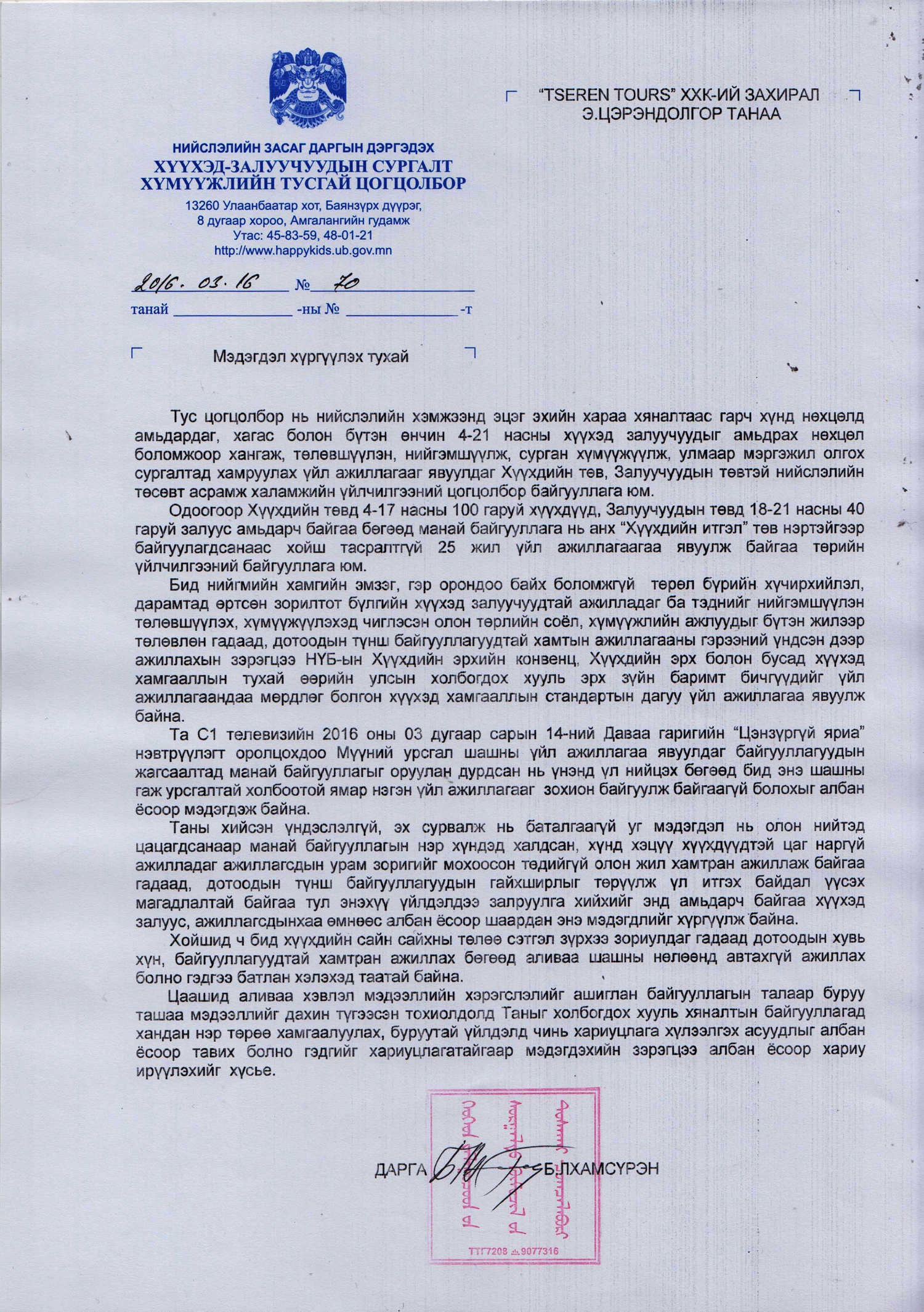 ХХК-ийн захирал Э.Цэрэндолгор нарт хүргүүлсэн болногэж Нийслэлийн Засаг даргын дэргэдэх Хүүхдийн сургалт, хүмүүжлийн тусгай төвөөс мэдээллээ.