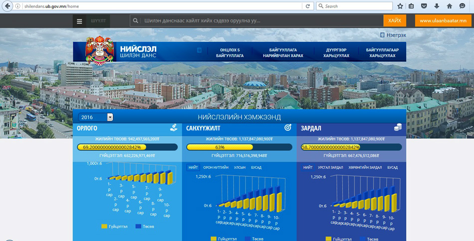Сайн засаглалыг бэхжүүлэх нэг чухал нөхцөл нь төрийн байгууллагын үйл ажиллагаа болон төсвийн илт тод, хариуцлагатай байдлыг дээшлүүлэх явдал юм. Нийслэлээс засаглалыг сайжруулах, төрийн үйлчилгээг ил тод, тэгш, хүртээмжтэй үзүүлэх зорилгоор сүүлийн жилүүдэд олон ажлыг санаачлан зохион байгуулж байна. Түүний нэг нь нээлттэй, ил тод зарчмыг баримтлан нийслэлийн ИТХ-аас гаргасан тогтоол, шийдвэр, нийслэлийн Засаг даргын захирамж, төсвийн мэдээлэл, удирдлагуудын гадаад, дотоод томилолтын зардлын тайлан, тендерийн мэдээллийг Нийслэлийн ЗДТГ-ын www.ulaanbaatar.mn цахим хуудсаар шуурхай хүргэж байна. Харин Монгол Улсын Ерөнхийлөгч Шилэн дансны тухай хууль санаачлан, УИХ-аар батлан, хэрэгжиж эхэлснээс хойш “Шилэн данс” цэсийг тус цахим хуудсанд ажиллуулж байна. Хуулийг нийслэл манлайлан хэрэгжүүлж байгаа бөгөөд төсвийн мэдээллийг иргэдэд танилцуулахаас гадна ирэх оны төсвийн төслийг бэлтгэхдээ хороогоор дамжуулан санал асуулгад санал авч, иргэдийн саналыг тусган ажиллаж байгаа юм.