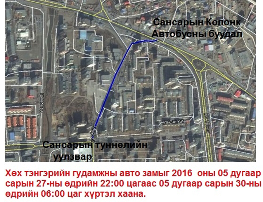 Хөх тэнгэрийн гудамжны авто замын зорчих хэсгийг засварлах ажил эхлээд байна. Наранбулаг Хан ХХК уг ажлыг гүйцэтгэж буй бөгөөд Токиогийн гудамж, Сансарын ШТС-аас урагш, Залуучуудын гудамж хүртэл 623м авто замыг 2016 оны 05 дугаар сарын 27-ны өдрийн 22:00 цагаас 05 дугаар сарын 30-ны өдрийн 06:00 цаг хүртэл бүрэн хааж суурь болон өнгө асфальтбетон хучилт хийх болсныг мэдэгдье. Иймд зам хааж буй дээрх хугацаанд та бүхэн өөр замыг сонгон зорчино уу гэж Нийслэлийн Автозамын газраас мэдээллээ.