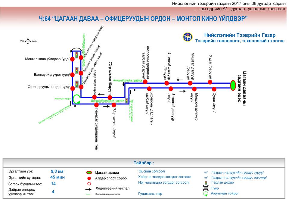 Нийслэлийн тээврийн газраас Баянзүрх дүүргийн 19, 20 дугаар хорооны иргэдийн зорчих эрэлтийг үндэслэн Ч:64 “Цагаан даваа-Офицеруудын ордон-Монгол кино үйлдвэр” гэсэн чиглэлийг шинээр нээлээ. Тус чиглэлд “Эрдэм транс” ХХК ажлын өдөр 3, амралтын өдөр 2 гаралтаар 15-17 минутын зайтай үйлчилнэ.