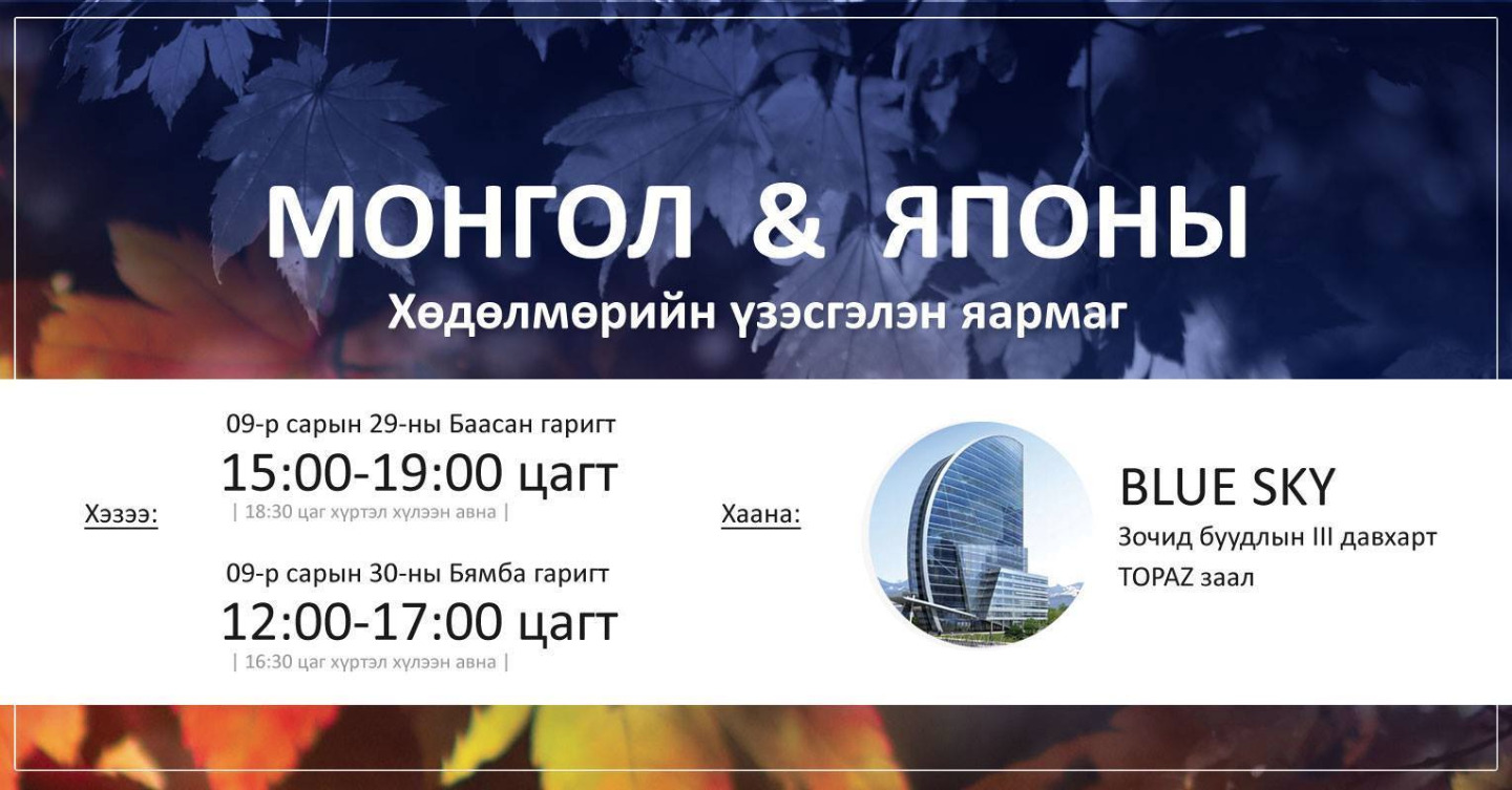 Нийслэлийн хөдөлмөр эрхлэлтийн газар нь “Лайсэн Академи”-тэй хамтын ажиллагааны хүрээнд “Монгол Японы хөдөлмөрийн яармаг”-ийг 2 өдрийн турш “BLUE SKY” зочид буудлын DAIMOND зааланд зохион байгуулж байна.