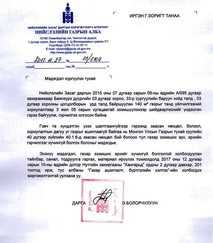 Мэдэгдэх хуудаст “хүндэтгэн үзэх шалтгаангүйгээр гэрээнд заасан нөхцөл, болзол зориулалтын дагуу уг газрыг ашиглаагүй байгаа нь Монгол Улсын Газрын тухай хуулийн 40 дүгээр зүйлийн 40.1.6-д заасан нөхцөл бий болсон тул газар эзэмших эрх, эрхийн гэрчилгээг хүчингүй болгох болсныг мэдэгдье” гэжээ.