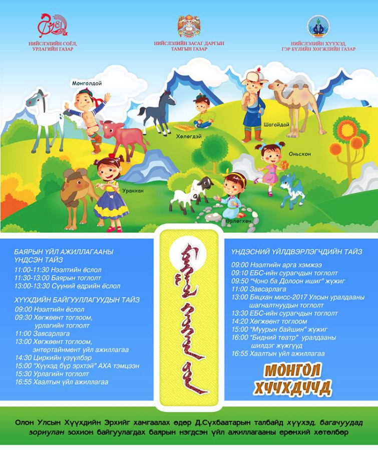 06-р сарын 01-нд 09:00-17:00 цагийн хооронд “МОНГОЛ ХҮҮХДҮҮД” баярын арга хэмжээг Д.Сүхбаатарын талбайд зохион байгуулна.