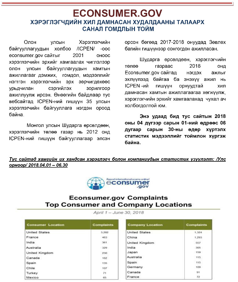 Эхлэл » » ECONSUMER.GOV САЙТЫН ХЭРЭГЛЭГЧДИЙН ХИЛ ДАМНАСАН ХУДАЛДААНЫ ТАЛААРХ САНАЛ ГОМДЛЫН ТОЙМ
