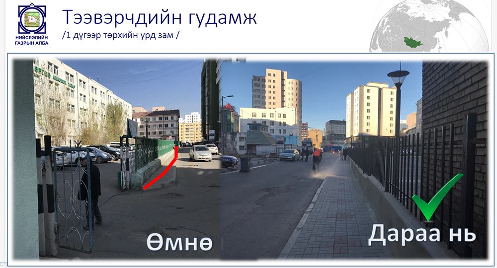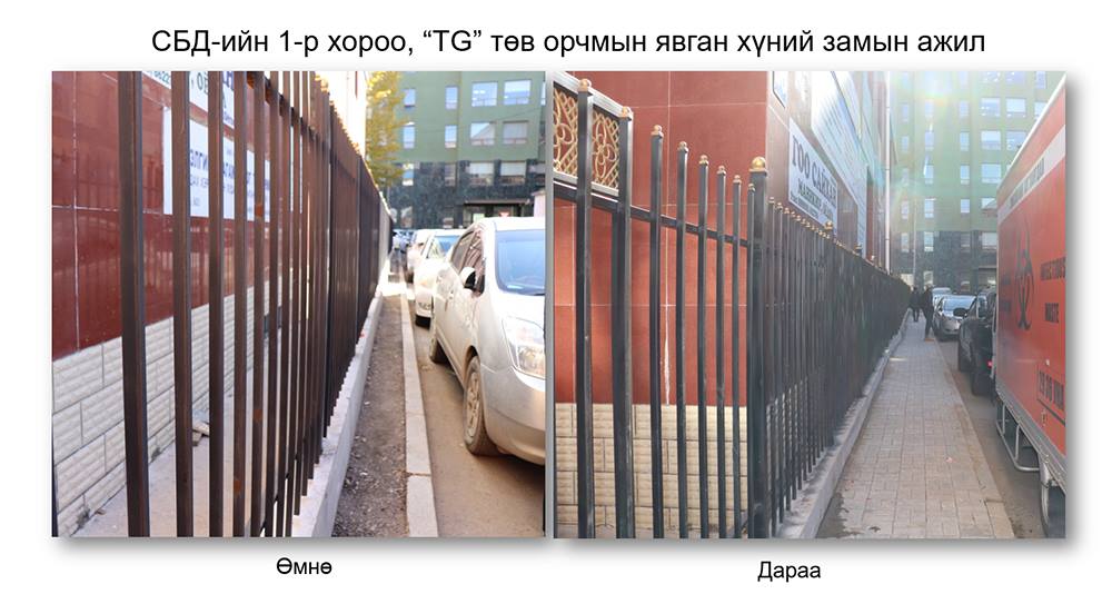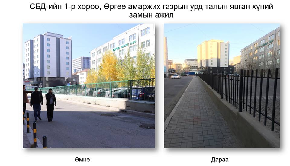 Нийслэлийн Засаг даргын өнгөрсөн наймдугаар сард гаргасан захирамжаас хойш ХУД-ийн 11 дүгээр хороо, ХААИС-ийн баруун талын явган хүний замын ажил, ЧД-ийн 2 дугаар хороо, Бөмбөгөр худалдааны төвөөс 24 дүгээр сургууль хүртэлх гражийн хамгаалалтын шон суулгах ажил, СБД-ийн 8 дугаар хороо, Туушин зочид буудлын өмнөх хана буулгах ажил, СБД-ийн 1 дүгээр хороо Платиниум зочид буудлын орчмын явган хүний замын ажил зэрэг нийт есөн байршилд явган хүний замын тохижилтын ажлыг хийж гүйцэтгэсэн байна.