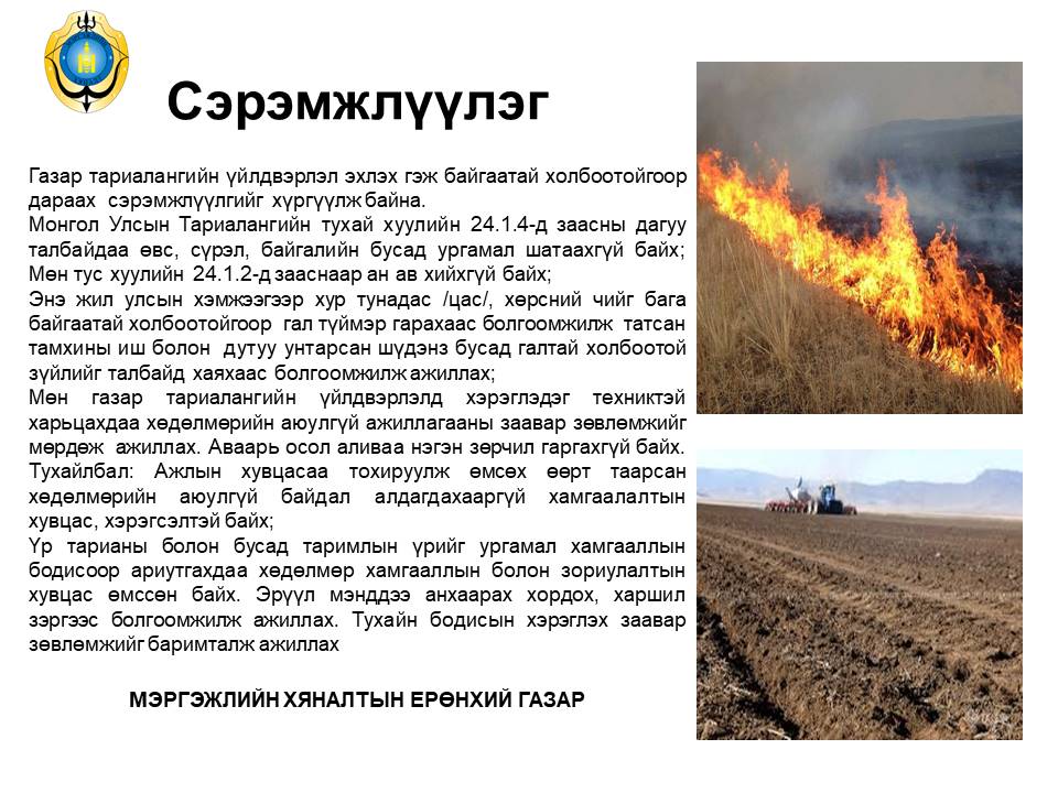 Монгол Улсын “Тариалангийн тухай” хуулийн 24.1.4-д зааснаар Тариалангийн үйлдвэрлэл эрхэлж байгаа газарт өвс, сүрэл, байгалийн бусад ургамал шатаахыг хориглоно.