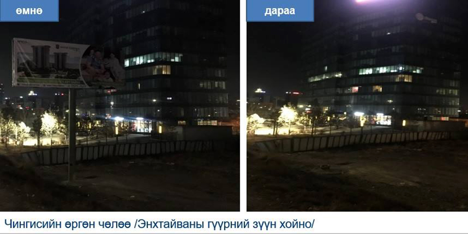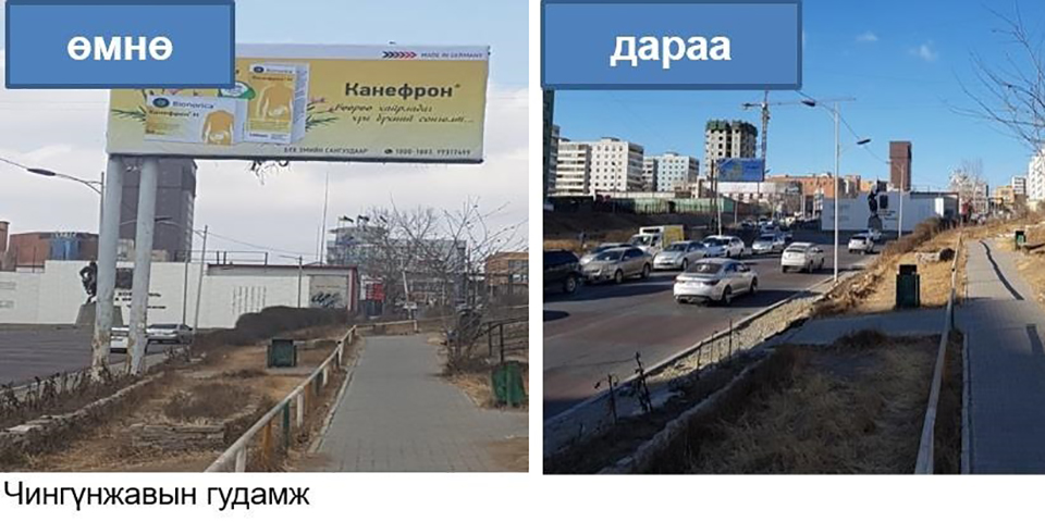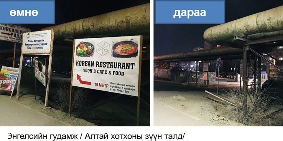 Энэ ажлын хүрээнд Энхтайваны өргөн чөлөө буюу МҮЭСТО-ы зүүн хойно байрлуулсан сурталчилгааны самбар, Чингисийн өргөн чөлөө буюу Энхтайваны гүүрийн зүүн болон баруун хойно байрлуулсан самбар, Энгелсийн гудамж буюу “Алтай” хотхоны зүүн талын, “Нарны зам” дагуух “Гермес” төвийн зүүн талын, мөн Чингүнжавын гудамжинд байрлуулсан самбар гээд журам зөрчсөн 10 гаруй самбарыг буулгаад байна.