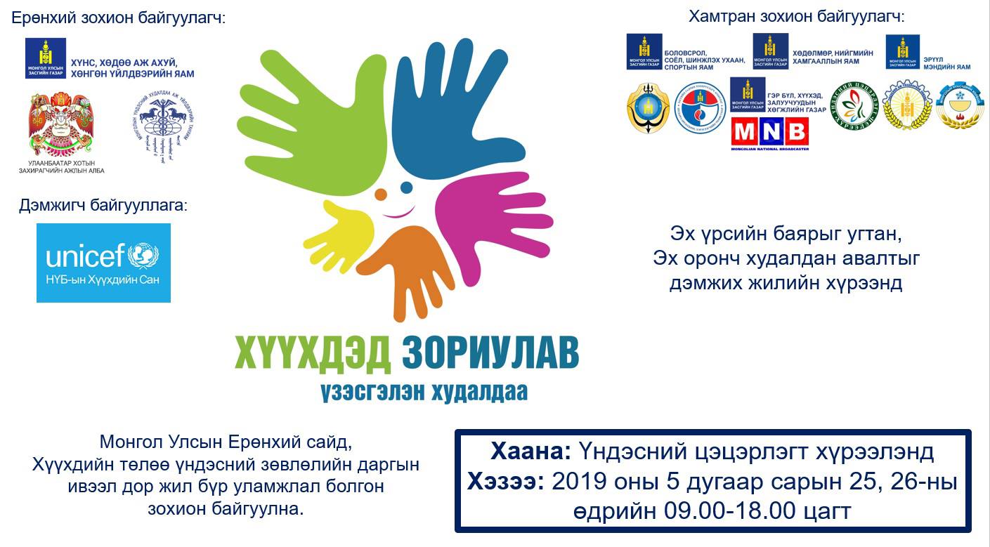 Эх үрсийн баярыг угтан “Эх оронч худалдан авалтыг дэмжих жил”-ийн хүрээнд үндэсний үйлдвэрлэгчдийн бүтээгдэхүүний “Хүүхдэд зориулав-2019” үзэсгэлэн худалдааг энэ сарын 25, 26-ны өдрийн 09.00-18.00 цагт Үндэсний цэцэрлэгт хүрээлэнд зохион байгуулна. Үзэсгэлэн худалдааны зохион байгуулагчаар ХХААХҮЯ, БСШУСЯ, ХНХЯ, ЭМЯ, МХЕГ, ШӨХТГ, ГБХЗХГ, НЗДТГ, УБЗАА, МҮОНРТ, МҮХАҮТ, ҮАҮЗ, МХХ хамтран ажиллаж байна.