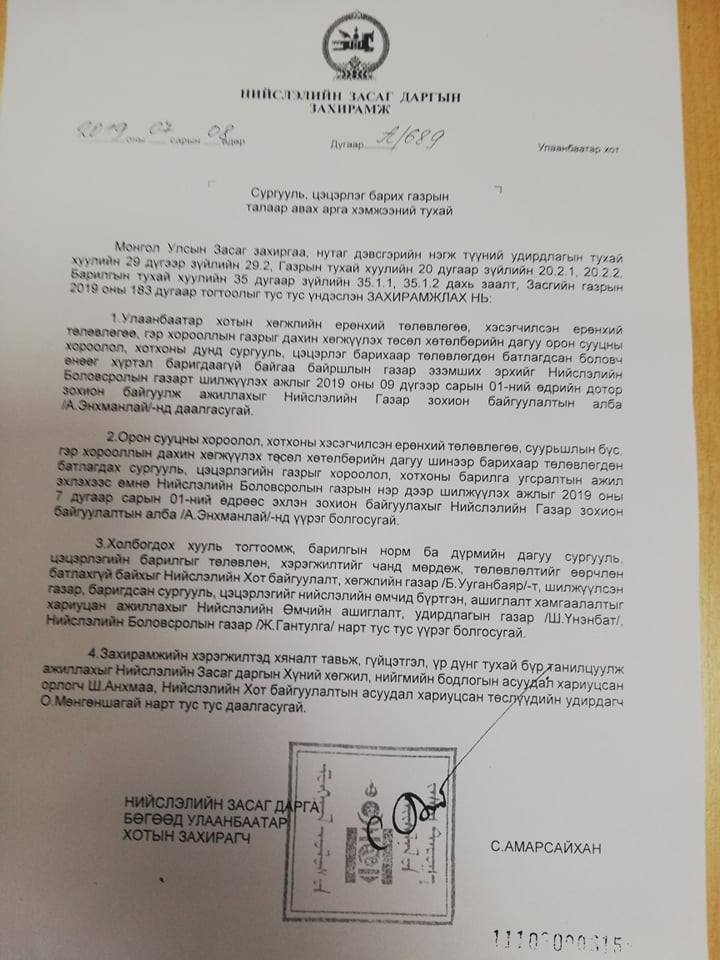 Захирамжид “Орон сууцны хороолол, хотхоны хэсэгчилсэн ерөнхий төлөвлөгөө, суурьшлын бүс, гэр хорооллыг дахин төлөвлөж хөгжүүлэх төсөл хөтөлбөрийн дагуу шинээр барихаар төлөвлөгдөх сургууль, цэцэрлэгийн газрыг хороолол, хотхоны барилга угсралтын ажил эхлэхээс өмнө нийслэлийн Боловсролын газрын нэр дээр шилжүүлэх ажлыг 2019 оны долдугаар сарын 07-ны өдрөөс эхлэн зохион байгуулахыг нийслэлийн Газар зохион байгуулалтын алба /А.Энхманлай/-нд үүрэг болгосугай” гэжээ. Мөн холбогдох хууль тогтоомж, барилгын норм ба дүрмийн дагуу сургууль, цэцэрлэгийн барилгыг төлөвлөн, хэрэгжилтийг чанд мөрдөж, төлөвлөлтийг өөрчлөн батлахгүй байхыг нийслэлийн Хот байгуулалт, хөгжлийн газарт, шилжүүлсэн газар, баригдсан сургууль, цэцэрлэгийг нийслэлийн өмчид бүртгэн, ашиглалт хамгаалалтыг хариуцан ажиллахыг нийслэлийн Өмчийн ашиглалт, удирдлагын газарт тус тус үүрэг болгосон байна.