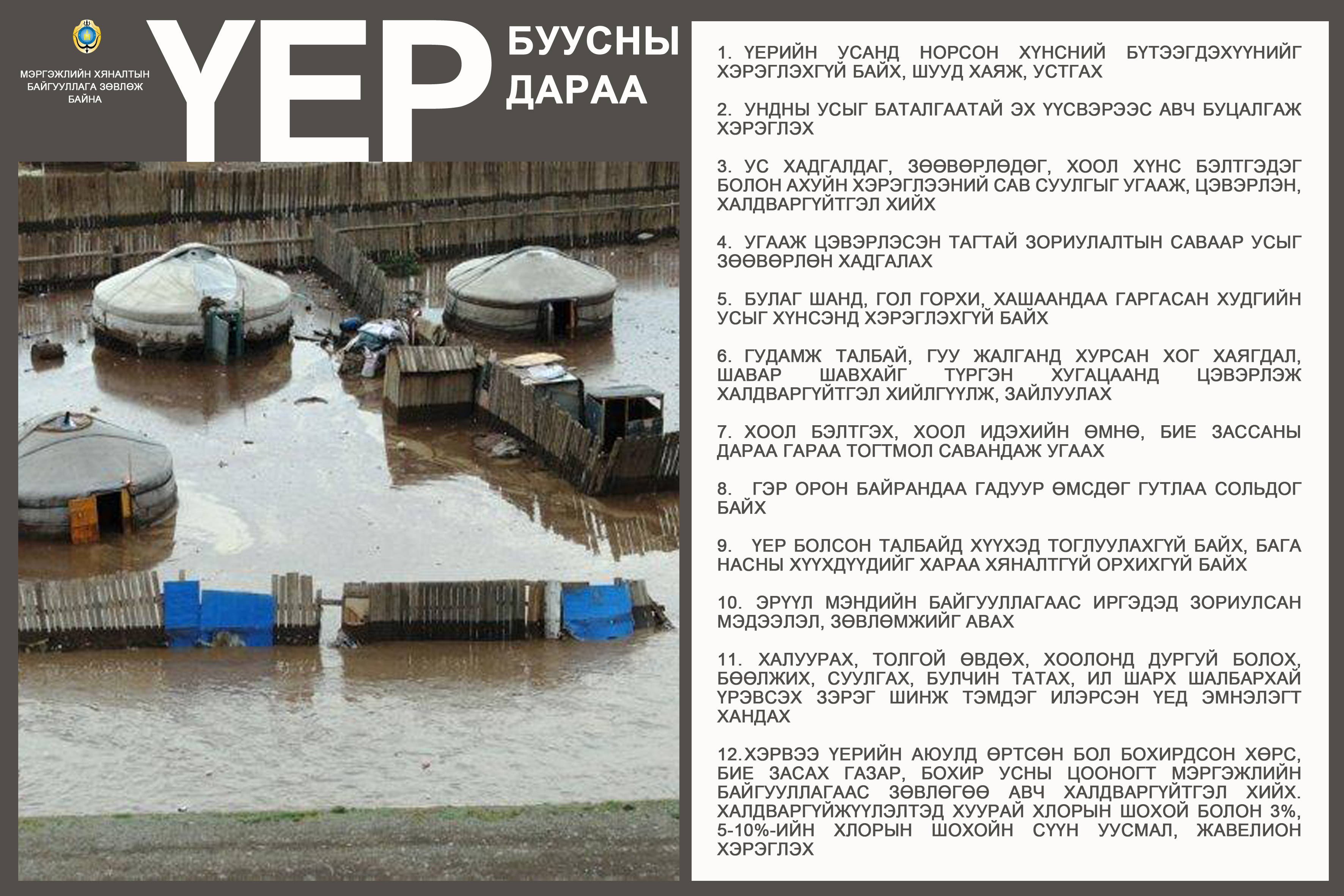 Хур тунадас, аадар бороо их хэмжээгээр орж усны үерт айл өрх, аж ахуйн нэгжүүд автах нөхцөл үүсч байгаатайхолбогдуулан хүнсний аюулгүй байдал алдагдах болзошгүй эрсдэлээс урьдчилан сэргийлэх зорилгоор хоол, хүнсний үйлдвэрлэл, үйлчилгээ эрхлэгч аж ахуйн нэгж, байгууллага, иргэдэд Мэргэжлийн хяналтын ерөнхий газраас ЗӨВЛӨЖ байна. Үүнд: