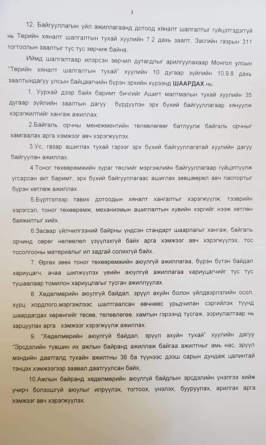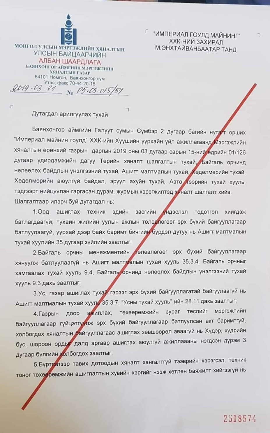 Тус компанид энэ оны гуравдугаар сард аймгийн Мэргэжлийн хяналтын газраас хяналт шалгалт хийхэд ТЭЗҮ, байгаль орчны менежментийн төлөвлөгөө зэрэг баримтын бүрдэл дутуу, Аюулгүй байдлын арга хэмжээнд хөрөнгө төсөвлөж зарцуулаагүй, Ажилтнуудыг амь нас, эрүүл мэндийн даатгалд хамруулаагүй, Хөдөлмөрийн аюулгүй байдлын эрсдэлийн үнэлгээ хийгээгүй, Хамгаалах хэрэгслийг хэрэглүүлж хэвшүүлээгүй, Дотоод хяналт хийдэггүй зэрэг зөрчил дутагдал илэрсэн тул 12 заалт бүхий албан шаардлага өгч, улсын байцаагчийн актаар үйл ажиллагааг нь зогсоосон.