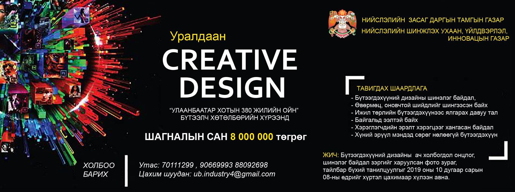 Улаанбаатар хотын 380 жилийн ойг угтан Нийслэлийн Засаг даргын Тамгын газар, Нийслэлийн Шинжлэх ухаан, үйлдвэрлэл, инновацын газар хамтран “CREATIVE DESIGN” уралдааныг зарлалаа. Уг уралдааны зорилго нь олон улсын стандарт, шаардлагад нийцсэн, байгальд ээлтэй, дэвшилтэт техник, технологийг ашиглан өрсөлдөх чадвар бүхий чанартай, шинэлэг дизайнтай бүтээгдэхүүнийг зах зээлд нэвтрүүлсэн иргэн, аж ахуйн нэгжийг шалгаруулахад орших юм. Уралдаанд оролцох хүсэлтэй иргэн, аж ахуй нэгжүүдийн бүтээлийг энэ сарын 8-ныг хүртэл хүлээж авах аж.