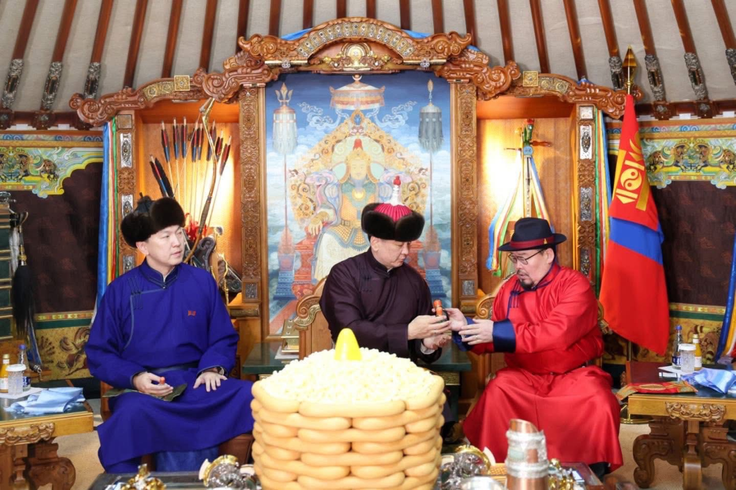 Үргэлжлүүлэн Улсын Их Хурлын дарга Н.Учрал, Монгол Улсын Ерөнхий сайд Г.Занданшатар нар төрийн тэргүүний амар мэндийг эрэн, золголоо.