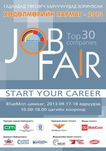 - Job Fair буюу “Хөдөлмөрийн Яармаг-2013” арга хэмжээ “Start Your Career!” уриан дор 9 сарын 17,18-ны өдрүүдэд 10:00-18:00 цагийн хооронд BlueMon цамхагт болно. Энэ удаагийн яармагт оролцсоноор ажлын байртай болох боломж залуу таньд байгаа учраас идэвхтэй оролцохыг уриалмаар байна.Q