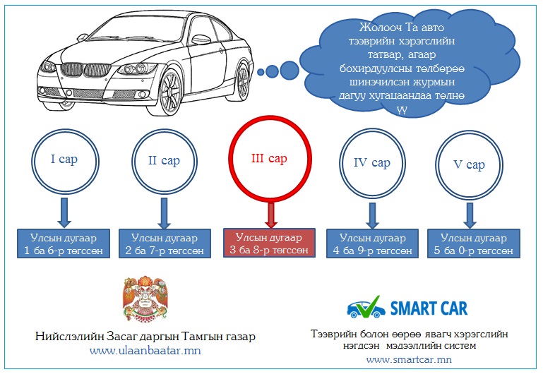 шимтгэл төлөхгүй. Мөн та автомашиныхаа улсын дугаараас хамааран 4,5 сард