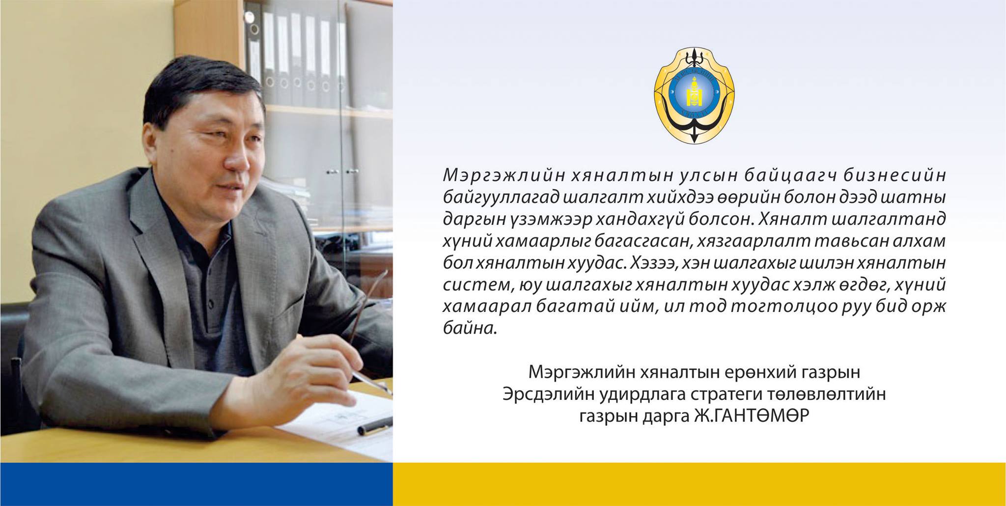 Төрийн нүд, чих болсон хяналт шалгалтын байгууллагын үйл ажиллагаа, хяналт шалгалт олон нийтэд ил тод, хурдан шуурхай болж байгаа нь сүүлийн үед илт мэдрэгдэх болсон. Тэгвэл хөгжлийн шинэ шатанд гаргах үйл ажиллагааны хүрээнд хийгдэж байгаа ажлын үйл явцын талаар Мэргэжлийн хяналтын Ерөнхий газрын Эрсдэлийн удирдлага, стратеги төлөвлөлтийн газрын дарга Ж.Гантөмөртэй ярилцлаа.
