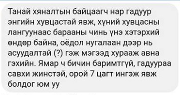Иргэнээс Мэргэжлийн хяналтын байгууллагад хандан “Танай байцаагч гадуур, энгийн хувцастай явж, хүний хувцасны лангуунаас барааны чинь үнэ хэтэрхий өндөр байна, оёдол нугалаан дээр нь асуудалтай гээд хурааж авна гэж байна. Ямар ч бичиг баримтгүй” гэсэн мэдээлэл ирүүлэв.