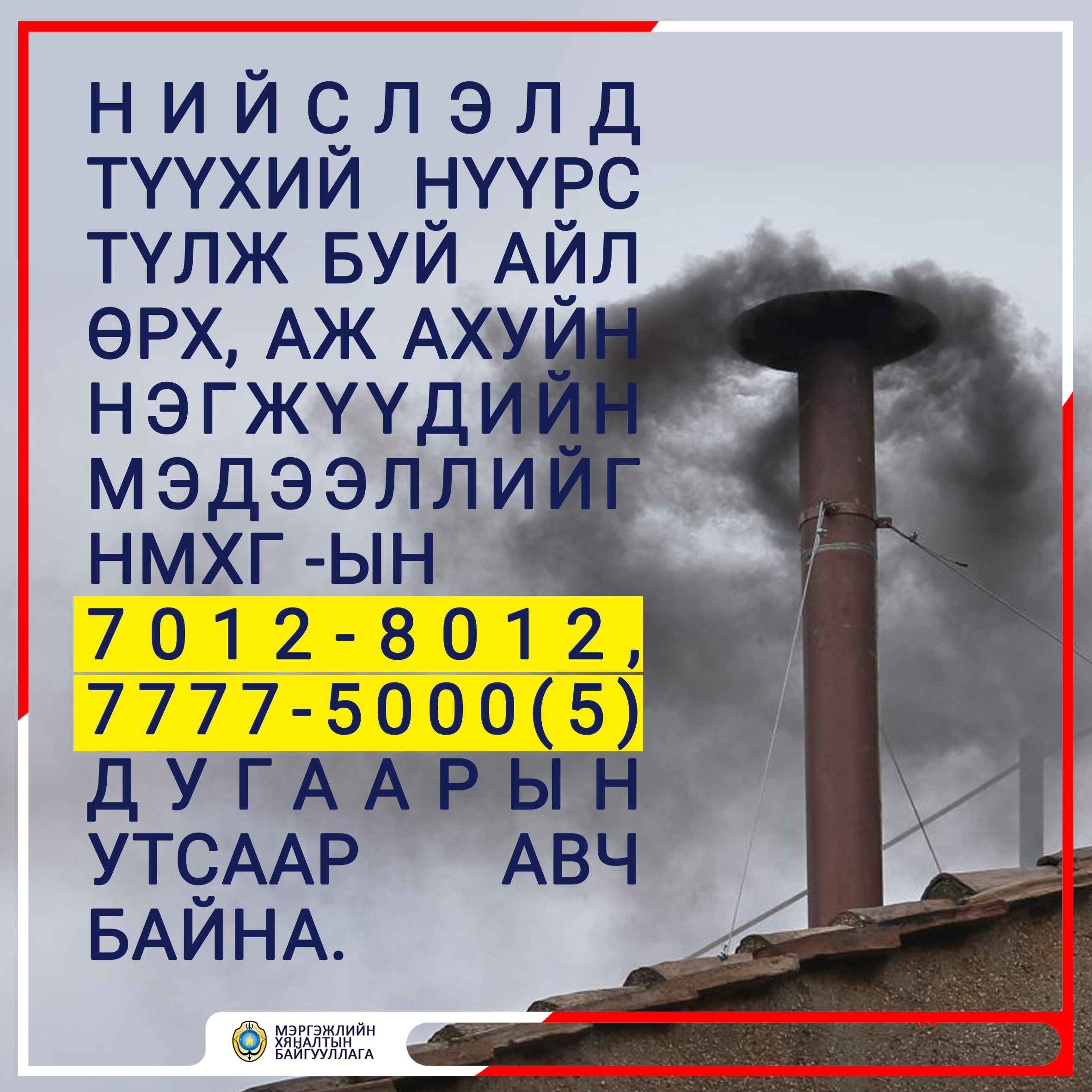 Нийслэлд түүхий нүүрс түлж буй айл өрх, аж ахуйн нэгжүүдийн мэдээллийг НМХГ-ын 7012-8012, 7777-5000(5) дугаарын утсаар авна
